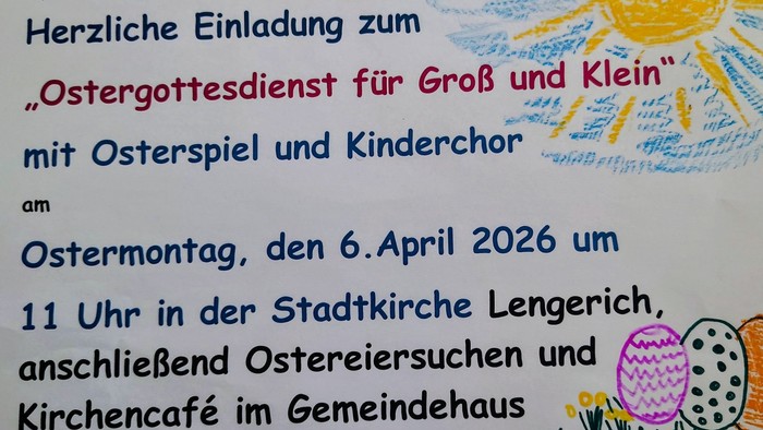 Herzliche Einladung zum Ostergottesdienst für Groß und Klein am 2. Ostertag, den 6.4.26 um 11 Uhr in der Stadtkirche.