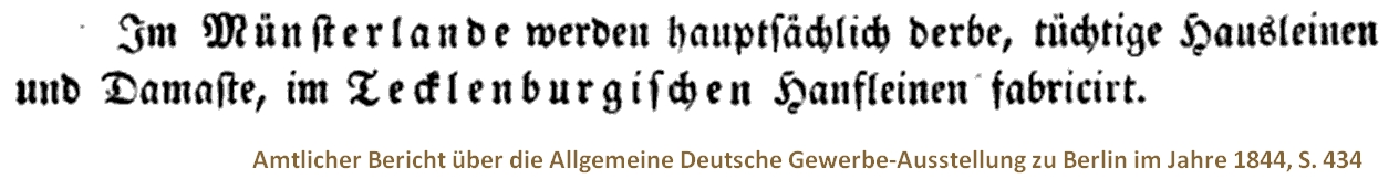 Im Gegensatz zu Münster und Osnabrück besteht das tecklenburger "Löwent-Leinen" hauptsächlich aus Hanf und wurde nach Bremen und Hamburg abgesetzt, über Cadiz, Bilbao, London und Amsterdam sogar nach Übersee exportiert.