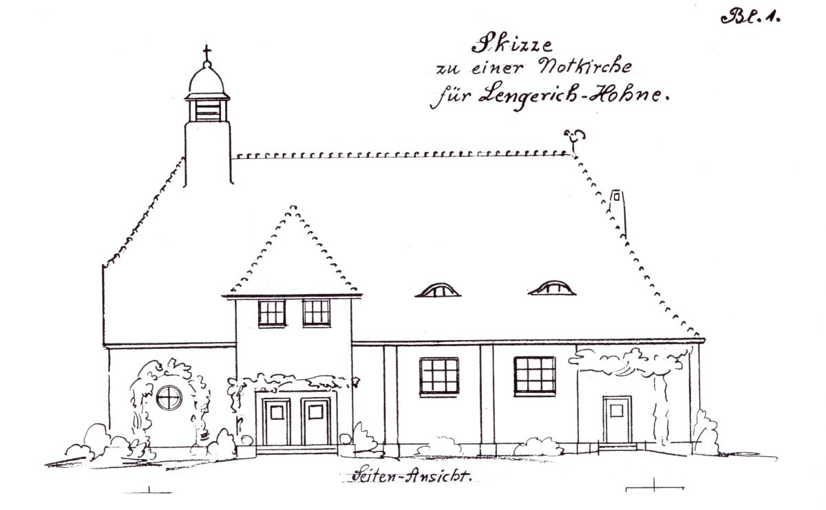 Im März legt Baurat Karl Siebold eine Skizze für eine evangelische Notkirche in Hohne vor mit 460 Plätzen nach dem Prinzip "dehnbare Kirche" (die Kirche ist bei Bedarf um den Konfirmanden- Raum erweiterbar).
