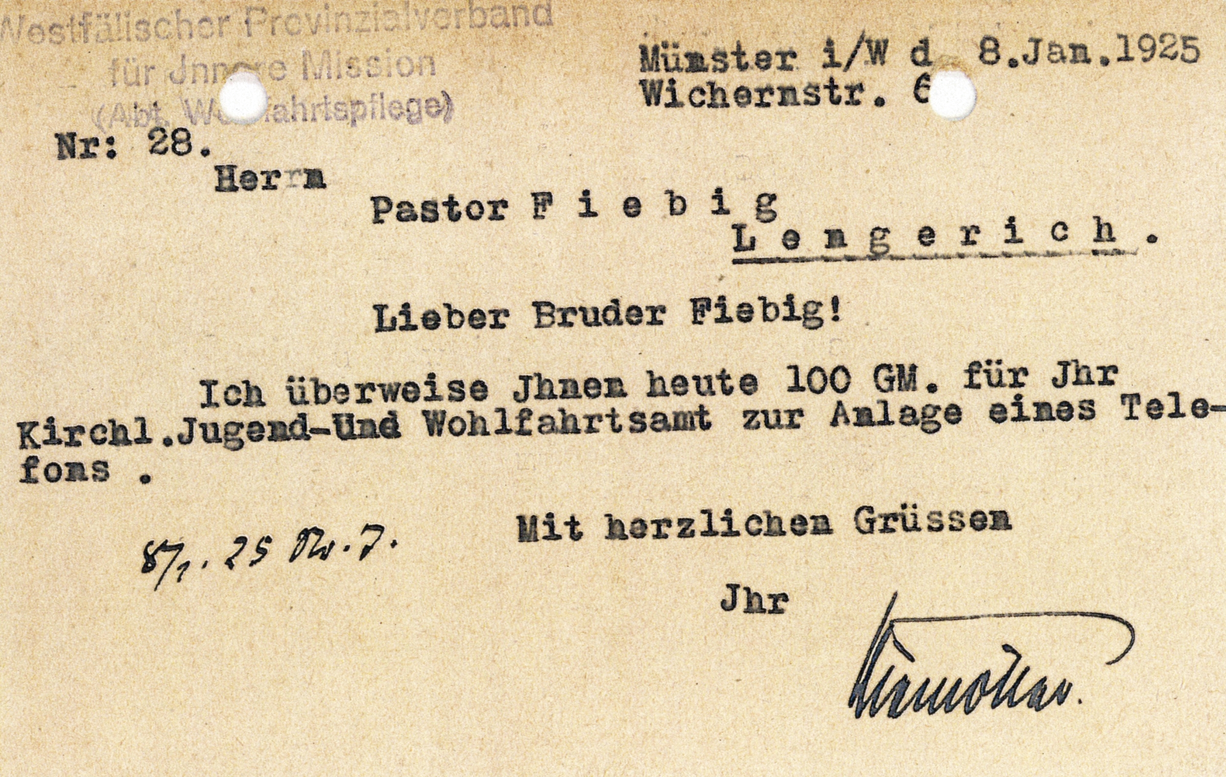 Pfarrer Martin Niemöller (damals beim Westfälischen Provinzialverband für Innere Mission] hatte bereits im Vorfeld das Amt zuvor unterstützt mit 100 Goldmark "zur Anlage eines Telefons".