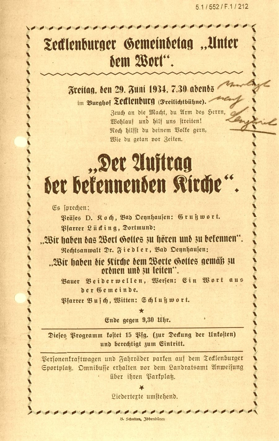 Im Vorfeld der Kirchenwahlen werben die Lengericher Pfarrer für das "ungekürzte Wort Gottes", eine strikte Trennung von Kirche und Staat und positionieren sich gleichzeitig "Für den Staat Adolph Hitlers!"