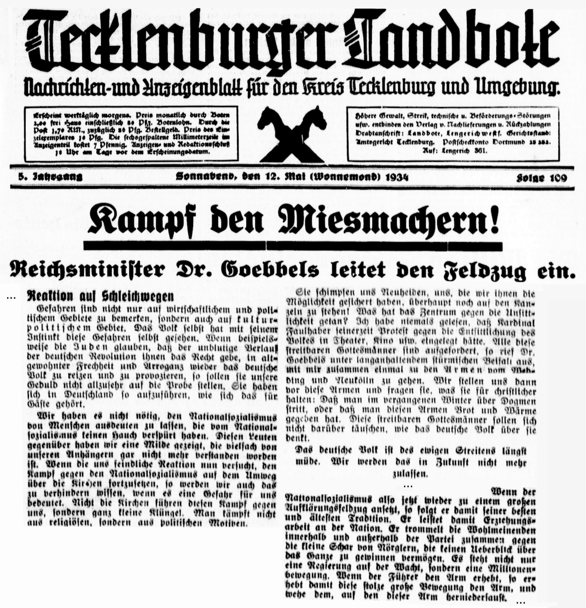 Am 1. Mai (Montag!) finden in allen evangelischen und katholischen Kirchengemeinden Lengerichs Festgottesdienste statt. Anschließend werden per Lautsprecher an den Kirchen die Reden von Goebbels und Hindenburg übertragen.