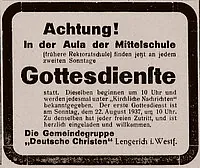 Ein Jahr später werden die DC Gottesdienste wegen Einberufung des DC-Pfarrers und mangels Beteiligung wieder eingestellt.